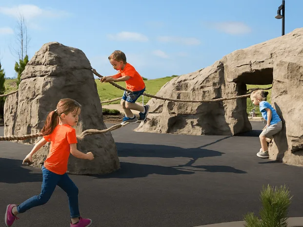 It does not have to be all bars and concrete. Terrain, sculptural forms, rope, natural-looking features, and tactile elements can create richer movement and stronger play value.